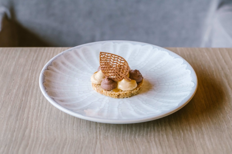 Vaig saber cruixent d’avellana amb cremós de dues xocolates i caramel salat
