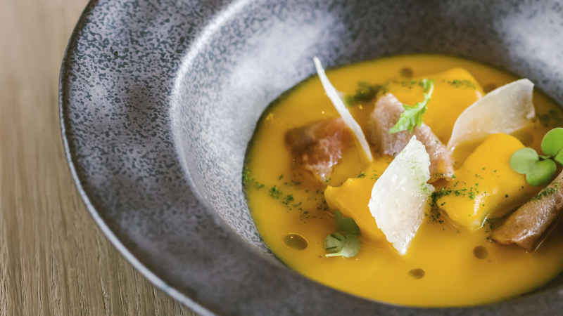 Ravioli farcits de carbassa rostida i ricotta, banyats en mantega de llamàntol i vi blanc.